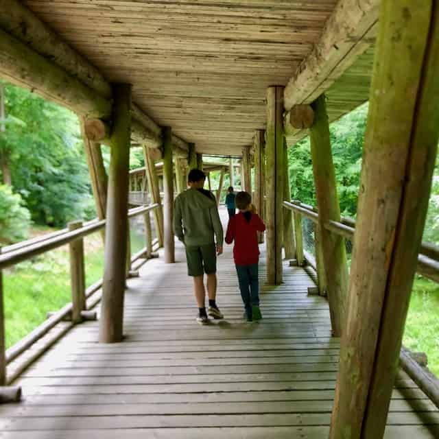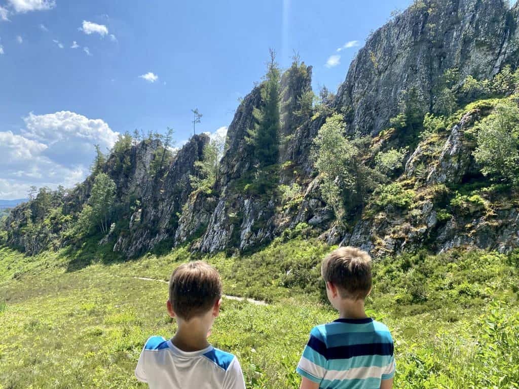 Vom Parkplatz an der Bundesstraße geht der Steinzeitweg entlang bis zum Eintritt in die Klamm in circa 1 Stunde bis eineinhalb sonders zu empfehlen: die Badestationen es gibt zwei größere Teiche Flüsse befinden die Groß und Klein einen Riesenspaß machen. Erwartet nicht, dass ihr den Steinzeitweg in der vorgeschlagenen Dreiviertelstunde gehen könnt – alle paar Meter gibt es eine neue Spielstation, in der die Kinder hängen bleiben. Der Weg startet gleich mit einer langen Rutsche, die uns einen Stopp von mindestens fünfzehn Minuten beschert hat. Perfekt für einen ruhigen Tag, in dem man sich ein wenig bewegt, aber auch die Kinder ihren Spaß haben.