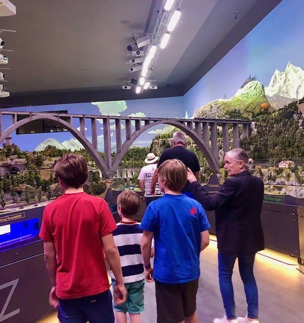 Das absolute Highlight: eine Halle, die eine gigantische Modelleisenbahnlandschaft der deutsch-, österreichischen und Schweizer Alpen zeigt. In der 190 Modellzüge der Deutschen Bahn, von ÖBB und SBB auf einer gut 2,7 Kilometer langen Strecke, die mehr als 8000 Figuren und über 80000 Bäume säumt, in 17 Minuten durch einen Tag fahren. Kennt ihr das Miniaturland in Hamburg? Diese Halle steht dem in nichts nach! Wir haben drei Tageszyklen à 17 Minuten angeschaut, inklusive Sonnenauf- und -untergang, Donner, Blitz und Sonnenschein. Total beeindruckend. Und wir hätten es uns noch fünf Mal ansehen können und hätten immer noch nicht jedes Detail gesehen.