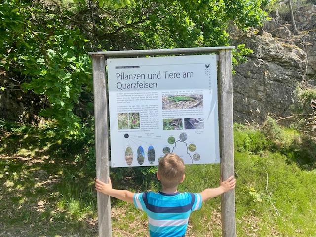 An mit Holzgeländer gesicherten Aussichtpunkten habt Ihr mehrmals schöne Blicke in den Steinbruch. Die Strecke ist nicht wirklich Kinderwagen-tauglich, daher würden wir Euch empfehlen, bei kleineren Kindern eine Kraxe mitzunehmen. Die meiste Zeit geht es durch einen schönen Mischwald, so dass diese Tour auch an heißen, sonnigen Tagen gut zu machen ist. Wir sind die Tour