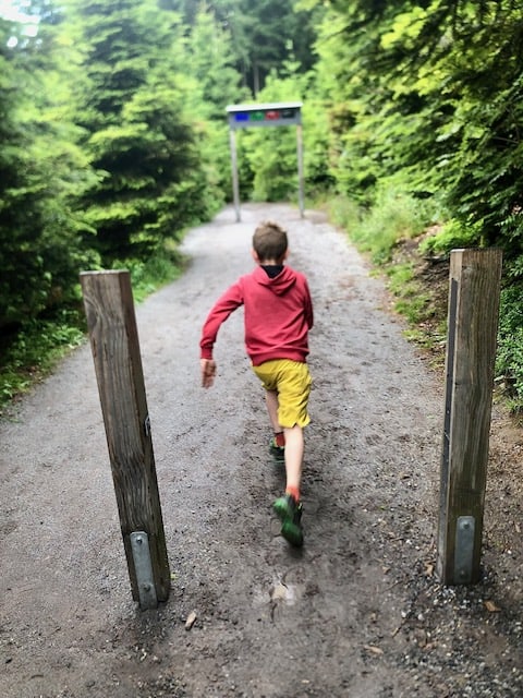 Für unsere wilden Jungs war es Spaß pur! Denn man kann den Weg ganz normal auf einem breiten Steg gehen, oder die einzelnen Stockwerke über Klettergerüste, Hängebrücken, etc. erklimmen. Ihr könnt Euch ja vorstellen, welchen Weg unsere Kinder gewählt haben und wer als Erstes oben war! Hinab geht es übrigens nicht nur zu Fuß! Alternativ kann man eine der beiden Rutschen nehmen, die sich an den Turm schmiegen. Eine Super-Gaudi! Zurück zum Gasthaus kann man eine schöne Schleife auf einem Naturlehrpfad drehen, der mit Schaukästen etwas über den Wald und seine Bewohner erzählt.