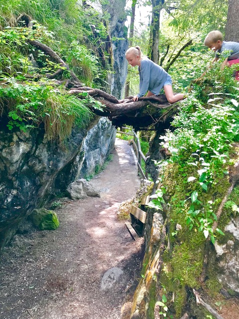 Am besten startet Ihr die Wanderung am Wirtshaus im Zauberwald. Ihr begebt Euch in Richtung Zauberwald/Hintersee und kommt nach einiger Zeit zu einer zauberhaften Miniatur-Schauinstallation. Gezeigt werden Handwerkskünste, eine Mühle und wer genau hinschaut, auch eine kleine Seilbahn. Unsere Kinder standen hier minutenlang davor und waren nicht wegzubewegen. Besser als all die Schaukästen in einem Märchenpark! Nach einiger Zeit gelangt Ihr in den Zauberwald. Der rauschende Bach führt Euch automatisch dorthin. Überall findet Ihr bemoste Felsbrocken, Wurzeln und gelbe Sumpfdotterblumen und neben dem eisblauen Bach wunderschöne Fotomotive.
