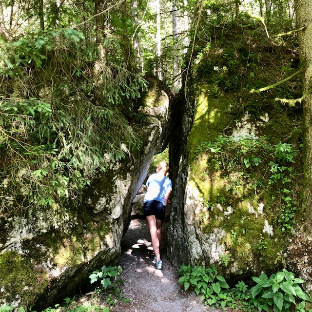 Die Texte sind leicht verständlich und kindgerecht – wir haben fast die ganze Tour über dies und das diskutiert. Kurz vor der Wallfahrtskirche kraxeln wir noch über und unter ein paar eindrucksvollen Felsen hindurch, um dann freie Sicht auf das Ensemble zu haben. Das Panorama mit den Felsen dahinter ist toll, und auch im Inneren beeindruckt uns die Kirche. Es ist weniger der berühmte Votivschmuck – bekannt ist vor allem das Gnadenbild, eine gekrönte sitzende Holzstatue der heiligen Maria, die mit der Rechten den sitzenden Jesusknaben mit einem Vögelchen hält.