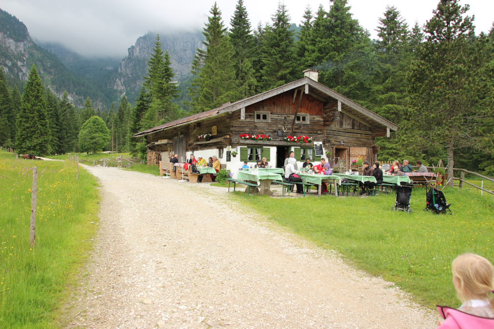 Im Winter kehren viele Wanderer und Rodler in der Kirchsteinhütte ein. Im Sommer empfehle ich aber eher die sonnigere, hintere Längentalalm, die noch ca. 45 Minuten weiter im hinteren Längental liegt. Sie liegt urromantisch an einem kleinen Bach. Außerdem lohnt es sich, die Wanderung ins hintere Längental fortzusetzen, denn es breitet sich eine traumhafte Landschaft vor einem aus: Gipfelziele wie die Benediktenwand, die Probstenwand oder der Längenberg. Bewirtschaftet ist die Hintere Längetalalm nur zur Almsaison. Neben Brotzeiten und Getränken werden auf der Hütte auch hausgemachte Kuchen und selbst gebrannte Schnäpse serviert. Alternativ kann man aber immer das ganze Jahr über in der Kirchsteinhütte einkehren. Zurück geht es den gleichen Weg.