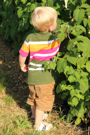 Anschließend ging es zum Beeren pflücken. Die Kinder hatten einen Riesen-Spaß! Wir wissen nicht, ob wir mehr Beeren im Bauch als in der Schale gesammelt haben. Je nach Saison gibt es Erdbeeren, Himbeeren, Heidelbeeren und Brombeeren.