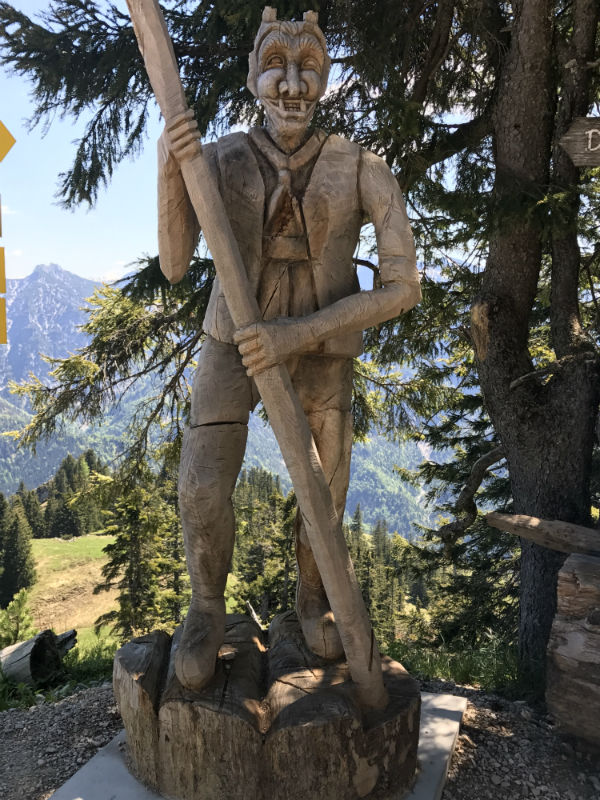 Ihr folgt dem Hauptweg vorbei am Restaurant “Rauschberghaus”, bis Ihr an das “Eingangstor” des Holzgeisterwegs kommt. Auf dem Weg erwarten Euch  schön gestaltete, interaktive Stationen zum Spielen und Lernen zu den Themen Schutzwald und Holz. Das Thema “Holz” ist  in der Ruhpoldinger Gegend sehr bekannt, weil hier früher Holz abgebaut wurde und überall Holztriften zu finden sind.  So könnt Ihr an Holzgeister-Stationen Lawinen auslösen oder Regen machen und trefft auf Holzgeister wie den “Kraxenbach Loder” – hört sich spannend an? Ist es auch! Der Rundweg dauert rund 45 Minuten und ist gut mit dem Kinderwagen machbar. Anschließend könnt Ihr entweder wieder mit der Seilbahn ins Tal fahren, den Weg zum Hinteren Rauschberg wagen (leider nicht mit dem Kinderwagen zu bewältigen) oder den Abstieg ins Tal antreten. Wir empfehlen letzteres! Allerdings müsst Ihr hierfür ca. dreieinhalb Stunden einplanen. Also nur für ältere oder geübtere Kinder geeignet!
