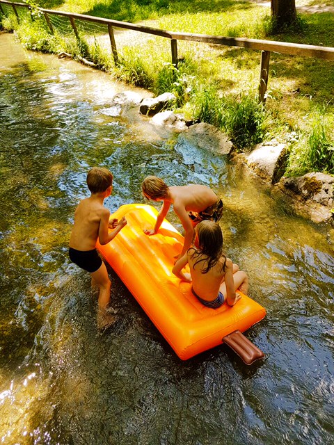 Wir Eltern standen ja schon länger nicht mehr auf den Skates, dementsprechend mussten wir erstmal die Anleitung und ein paar Youtube-Videos von Rollerblade anschauen und kurz in der Wohnung üben. Am Wochenende ging es dann auch schon los. Unser Auto parkten wir am Biergarten Hirschau. Von dort trippelten wir mit unseren Inlineskates durch den Biergarten-Kies zur geteerten Straße, die direkt am Obermeisterjägerbach liegt. Auf dieser Straße ließ es sich super skaten. Vorbei an idyllischen Badestellen an besagtem Bach, ruhigen Picknick-Orten und dem schönen Amphitheater (hier finden im Sommer übrigens kostenlos tolle Theateraufführungen statt) bis zum Aumeister hatten wir richtig viel Spaß. Wir brauchten hin und zurück jeweils 45 Minuten – perfekt für einen Halbtages-Ausflug. Natürlich gab es eine ausgiebige Einkehr im Aumeister-Biergarten – mmhh! Wieder zurück an der Hirschau hielten wir dann am Obermeisterjägerbach für einen Badestopp. Wunderschön!