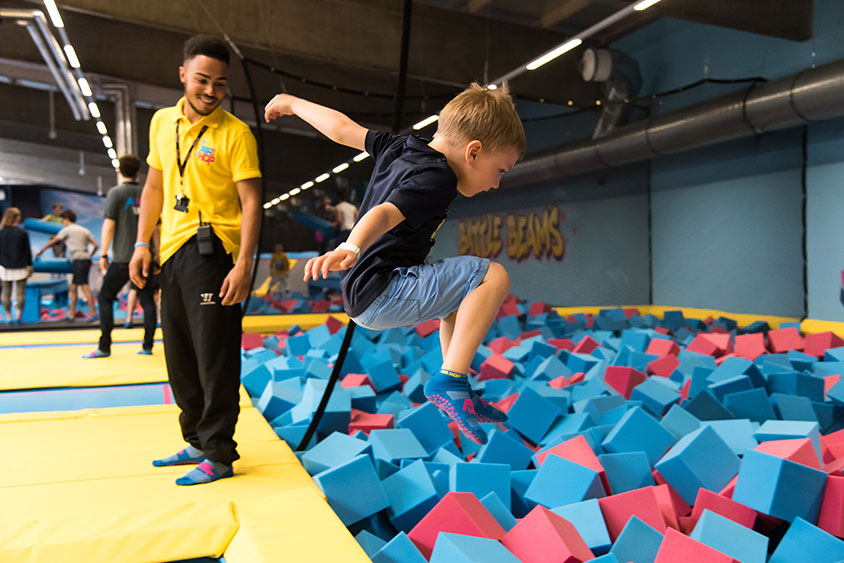 Nun heisst es eine Stunde lang AUSTOBEN! Da wird in Würfelbäder hineingehopst, von einem Trampolinfeld ins nächste gesprungen, auf einem Trampolin Basketballkörbe geschossen oder sich in einem separaten Feld mit Bällen gegenseitig abgeschossen. Das Highlight: Ein Karussell, in dem sich zwei gepolsterte Stäbe drehen, den man per Sprung ausweichen muss.