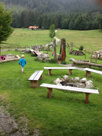 Wir laufen entlang an saftigen Wiesen, tauchen ab und zu ein in kleine Wälder und erreichen nach ca. 45-60 Minuten die familienbetriebene Käseralm. Ab und zu begegnet uns ein Biker aus dem Biker-Park, was die Kinder erfreut und erstaunen lässt. Auf der Käseralm erwartet uns eine herzhafte Brotzeit mit wunderschönem Ausblick auf den Hochries-Gipfel, und für die Kinder ein toller Naturspielplatz mit Klettergerüsten, Balanciermöglichkeiten und einem großen Sandkasten. Man kann die Käseralm auch mit dem Sessellift  (Achtung Einsitzer!) erreichen.