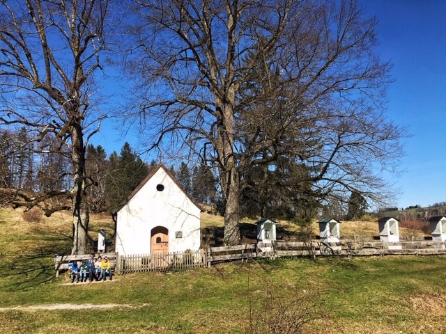 Hinter dem Sportplatz biegt Ihr rechts auf den Erlebnis-Wanderpfad. Dieser führt euch erstmal entlang des Waldes neben einem Bachlauf auf einem größeren Weg, bis ihr nach circa 500 m rechts auf die Buckelwiesen abbiegt. Ab jetzt geht es wunderschön in gemütlichem Tempo durch die seltene Moränen-Landschaft. Vorbei an der süssen Boschet-Kapelle, an der Ihr in der Sonne kurz rasten und die Sonnenstrahlen genießen könnt.