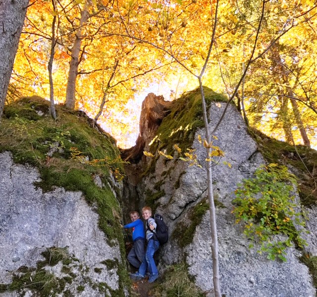 Nach ca. 45 Minuten gelangt Ihr zum Hugo-Ludwig-Steig, dem schönsten Stück Weg der Rundwanderung. Hier ist der Hang so steil, dass ein Weg durch den Stein geschlagen wurde. Höhepunkt ist ein kleines Törle, durch das man sich hindurch quetscht.