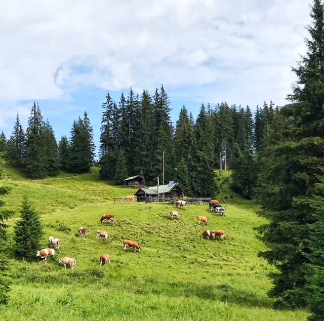 Zu Beginn der Rundtour liess sich der unbeliebte Ziehweg natürlich nicht vermeiden. Aber machte nichts, schließlich führte er an einem Bach entlang recht zügig den Berg hinauf. Nach ca. 45 Minuten erreichten wir einen Stausee. Hier ist es wichtig, die Abzweigung nicht zu verpassen. Denn es geht hier rechts Richtung “Kuhalm” auf den Teufelstättkopf-Weg. Nachdem wir eine einsame Berghütte mit einem großen Mobilfunknetzmast (und bei unserer Tour zahlreichen Kühen) passiert haben, gilt es erneut, die kleine Abzweigung links hoch auf den Teufelstättkopf nicht zu verpassen. Aber hier wurde es felsig und steil – geradezu perfekt für unsere Jungs. Während wir ihnen nach Luft ringend folgten, sind sie wie kleine Gämse den Berg hochgewetzt. Unterhalb des Teufelstättkopfes wurde es etwas ausgesetzt. Die letzten Meter auf den Teufelstättkopf waren jedoch mit Drahtseilen gesichert. Der Blick von oben auf die Ammergauer Alpen ist ein Traum!