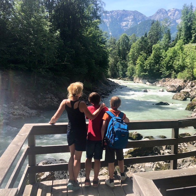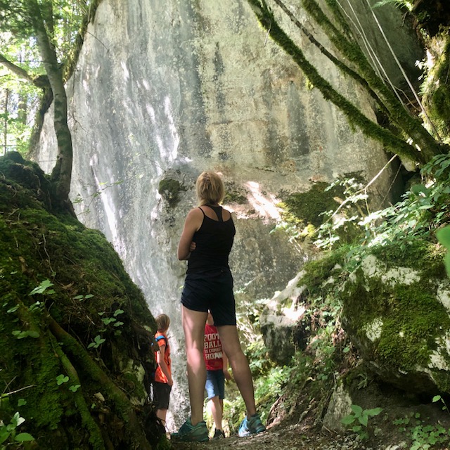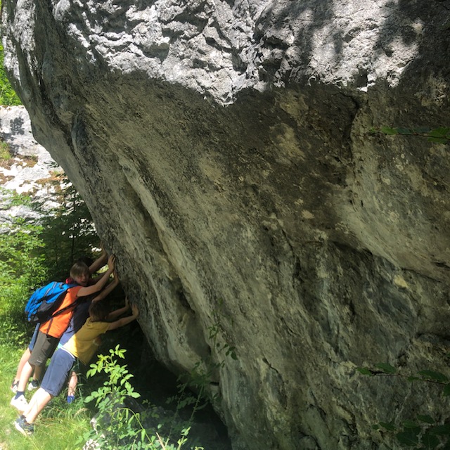 Wir dagegen laufen nun noch 200 Höhenmeter hangaufwärts durch den Wald und spazieren dann an den Hängen des Grubhörndls wieder zurück Richtung Lofer. Obwohl wir in der Ferienzeit hier sind, ist es erstaunlich ruhig – wahrscheinlich auch deswegen haben wir Glück und finden einen kinderhandgroßen Grasfrosch. Und es bleibt tierisch: Kurz vor der Rückkehr in den Ort kommen wir an der Löwenquelle vorbei. Das Wasser, das hier aus dem Berg kommt, soll so eine ganz besondere Qualität haben, dass der Loferer Nachbarort Unken vor 150 Jahren zum Heilbad erkoren worden wurde. Erfrischend ist es allemal… Ebenfalls auf dem Abstieg darauf folgt noch ein tolles Fotomotiv: Ein massiver Findling liegt am Rand des Pfades, unsere Jungs posieren im Sisyphus’schen Sinne, als würden sie den Steinriesen den Berg empor rollen.