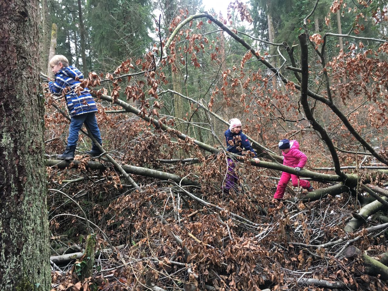 Achtung: Eiben sind giftig! Schon allein eine Handvoll Nadeln reicht aus, um eine Kuh zur Strecke zu bringen. Wenn er dann auch noch rote Früchte trägt, solltet Ihr Eure Kinder mehr als vorwarnen, die Hände von diesen zu lassen. Unsere Kids haben sich dafür aber auch gar nicht interessiert. Viel schöner war es, an den zahlreichen kleinen Bächlein, die durch den Wald führen, Staudämme zu bauen oder über Steine zu hüpfen. Im Wald liegen sehr viele umgestürzte Bäume, die ihnen als Balanciermöglichkeit dienten oder die sie kurzerhand zu Booten oder Bussen umfunktionierten, um auf imaginäre Reisen zu gehen. Die nette Beschilderung mit kleinen Erklärungstafeln zu Eiben waren dabei total nebensächlich – dennoch haben wir einiges gelernt. Schon allein die Rinde, der Baumstamm einer Eibe ist so besonders und fühlt sich so schön an, dass wir ab sofort jederzeit eine Eibe von anderen Nadelhölzern unterscheiden können. Eiben wachsen und gedeihen am besten auf Kalktuff – und das sieht man! Der Boden im Wald ist so lehmig, dass unsere Kinder tatsächlich das Töpfern und Kneten begonnen haben. Ihr könnt Euch vorstellen, wie sie danach aussahen…