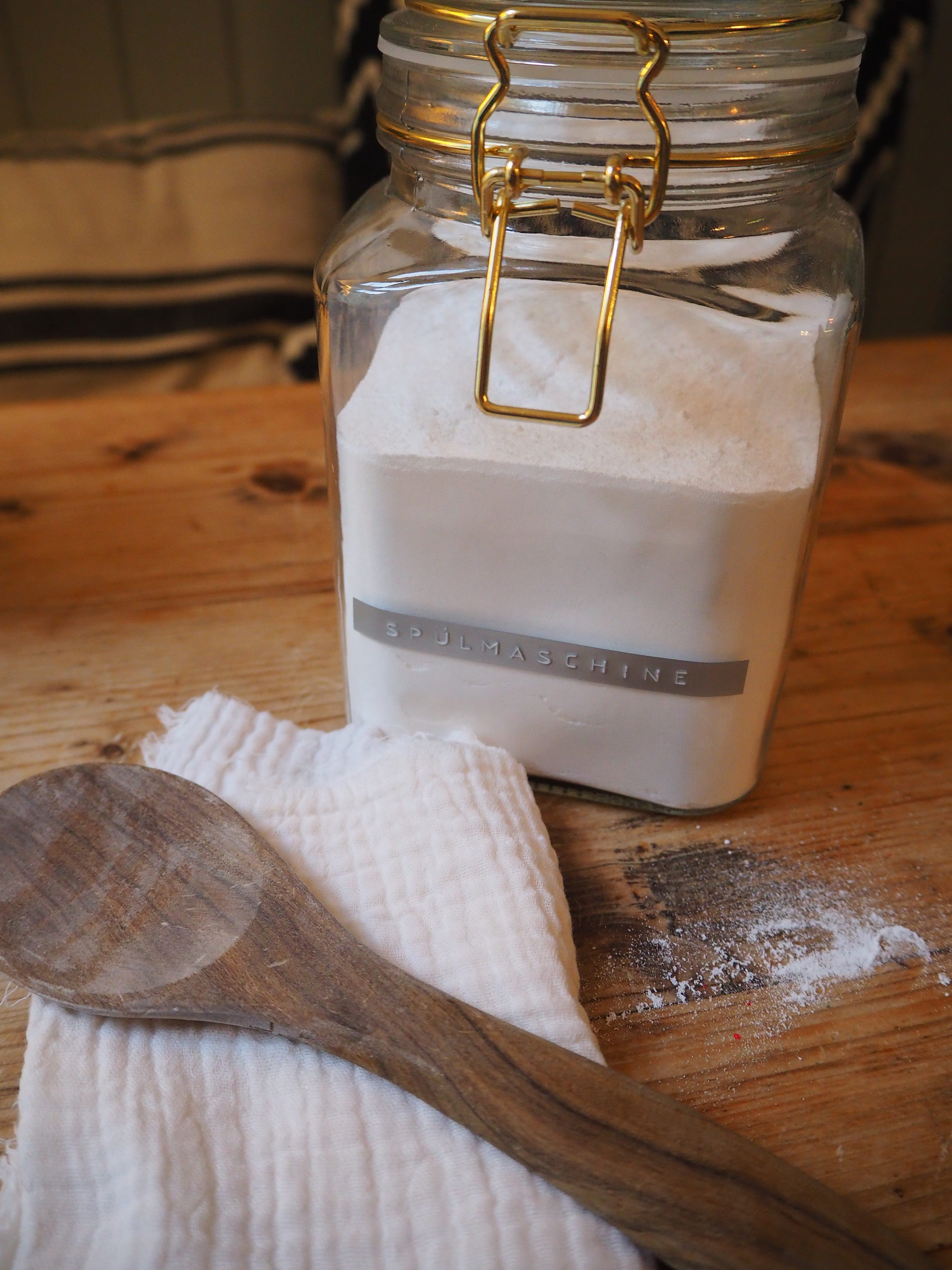 Also kauften wir Spülmaschinenpulver und füllten es in ein Gefäß um, um es besser portionieren zu können. Beim Umfüllen entstand eine Geruchswolke, die nicht gesund sein konnte. Außerdem befand sich nach dem Spülgang an einigen Dosen und Gläsern trotz allem immer wieder ein undefinierbarer Schleier. Da war klar: eine neue Lösung musste her. Wie wärs, Spülmaschinenpulver mal selbst herzustellen, um zu wissen, was genau dessen Inhaltsstoffe sind?