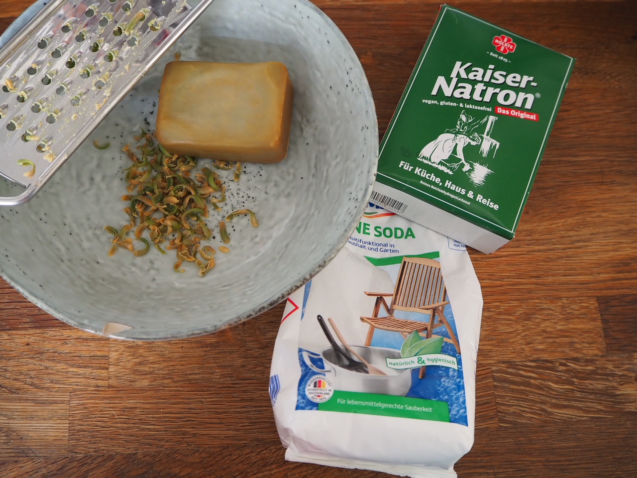 Das Seifenstück wird mit einer Küchenraspel geraspelt bzw. gerieben. Ihr vermischt die Seife mit den restlichen Zutaten und fügt alles in einen Behälter oder Glas. Jeder Waschgang wird mit 1,5 – 2 Esslöffel. des Waschpulvers befüllt. Wer mag, kann direkt zum Waschgang ein paar Tropfen ätherisches Öl dazu geben – Lavendel oder Limette riechen gut.
