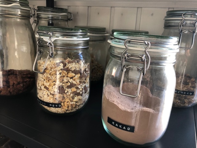 Damit die eingekauften Dinge auch Platz daheim finden, haben wir unser Regal besonders bestückt. Zum Einkaufen nehmen wir leere Behälter mit, das Gewicht wird vor dem “Zapfen” festgehalten, die Ware wird in die Behälter abgefüllt, bezahlt und nach Hause gebracht – alles ohne Verpackung. Ein großer Vorteil ist, dass man bewusster einkauft und nur die Menge, die man benötigt.